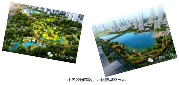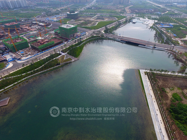 新川之心中央公園包括西區和東區,西部湖區總面積約為95000m2,分為東西兩片水域,其中東湖水面面積約為60000 m2,西湖水面面積為35000 m2,常水位時平均水深約2m。由南京中科水治理股份有限公司對湖區進行生態系統的構建。