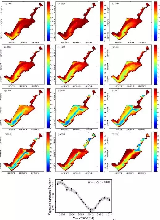 2003-2014年東太湖水生植物出現頻次空間分布和長期變化